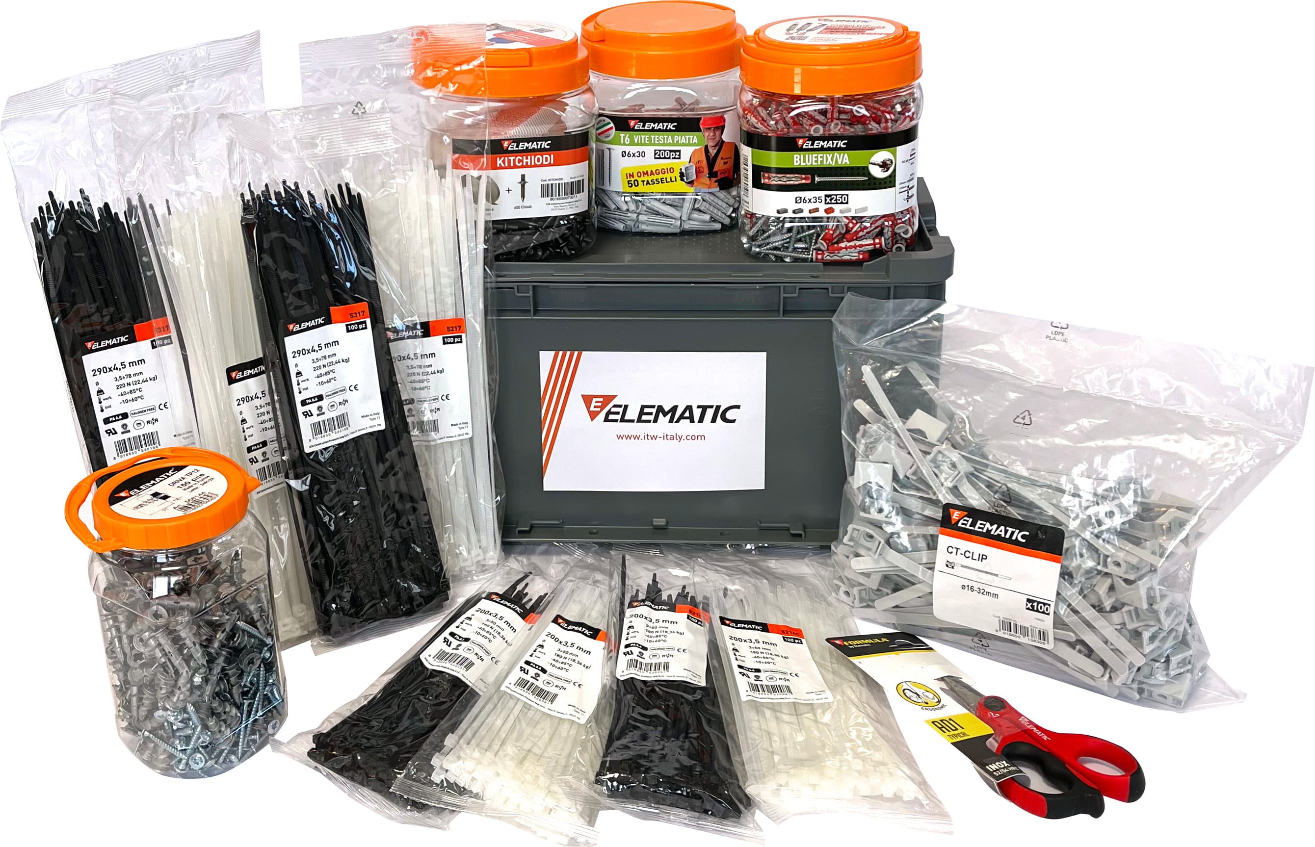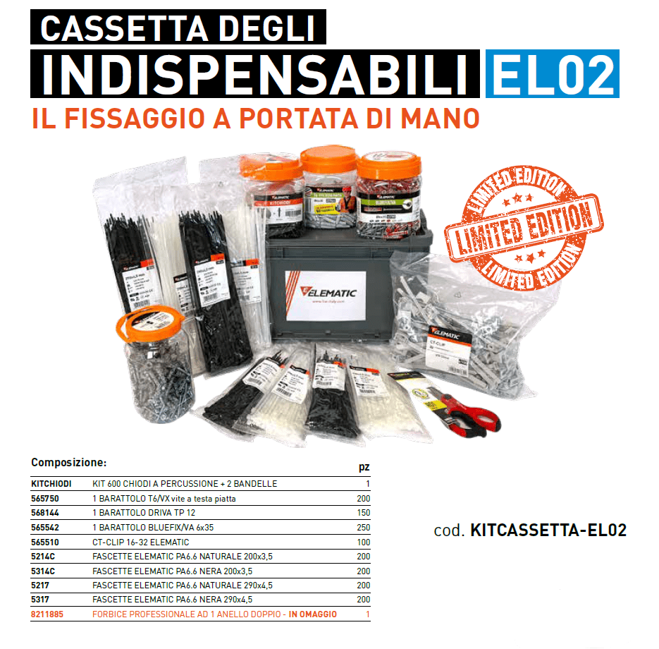 La cassetta degli indispensabili EL02 e un mix di prodotti Elematic Spit pensati esclusivamente per l'elettricista. All'interno troverai: KITCHIODI KIT 600 CHIODI A PERCUSSIONE + 2 BANDELLE (1 pz) 565750 1 BARATTOLO T6/VX vite a testa piatta (200 pz) 568144 1 BARATTOLO DRIVA TP 12 (150 pz) 565542 1 BARATTOLO BLUEFIX/VA 6x35 (250 pz) 565510 CT-CLIP 16-32 ELEMATIC (100 pz) 5214C FASCETTE ELEMATIC PA6.6 NATURALE 200x3,5 (200 pz) 5314C FASCETTE ELEMATIC PA6.6 NERA 200x3,5 (200 pz) 5217 FASCETTE ELEMATIC PA6.6 NATURALE 290x4,5 (200 pz) 5317 FASCETTE ELEMATIC PA6.6 NERA 290x4,5 (200 pz) 8211885 FORBICE PROFESSIONALE AD 1 ANELLO DOPPIO - IN OMAGGIO (1 pz)