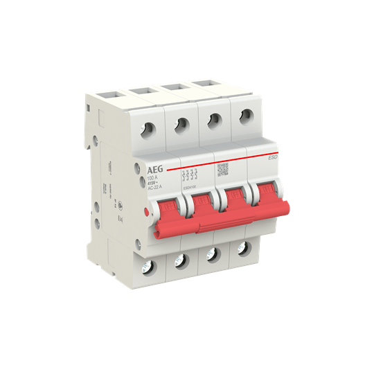 SEZIONATORE MODULARE AEG ESD, 4 POLI 4 MODULI, CORRENTE NOMINALE 100A, POTENZA DISSIPATA 11,2W, TENSIONE NOMINALE 415VAC, CATEGORIA D'IMPIEGO AC-22A DC-21A, FREQUENZA 50/60Hz, TEMPERATURA D'IMPIEGO -25/+55°C, TEMPERATURA DI STOCCAGGIO -40/+70°C