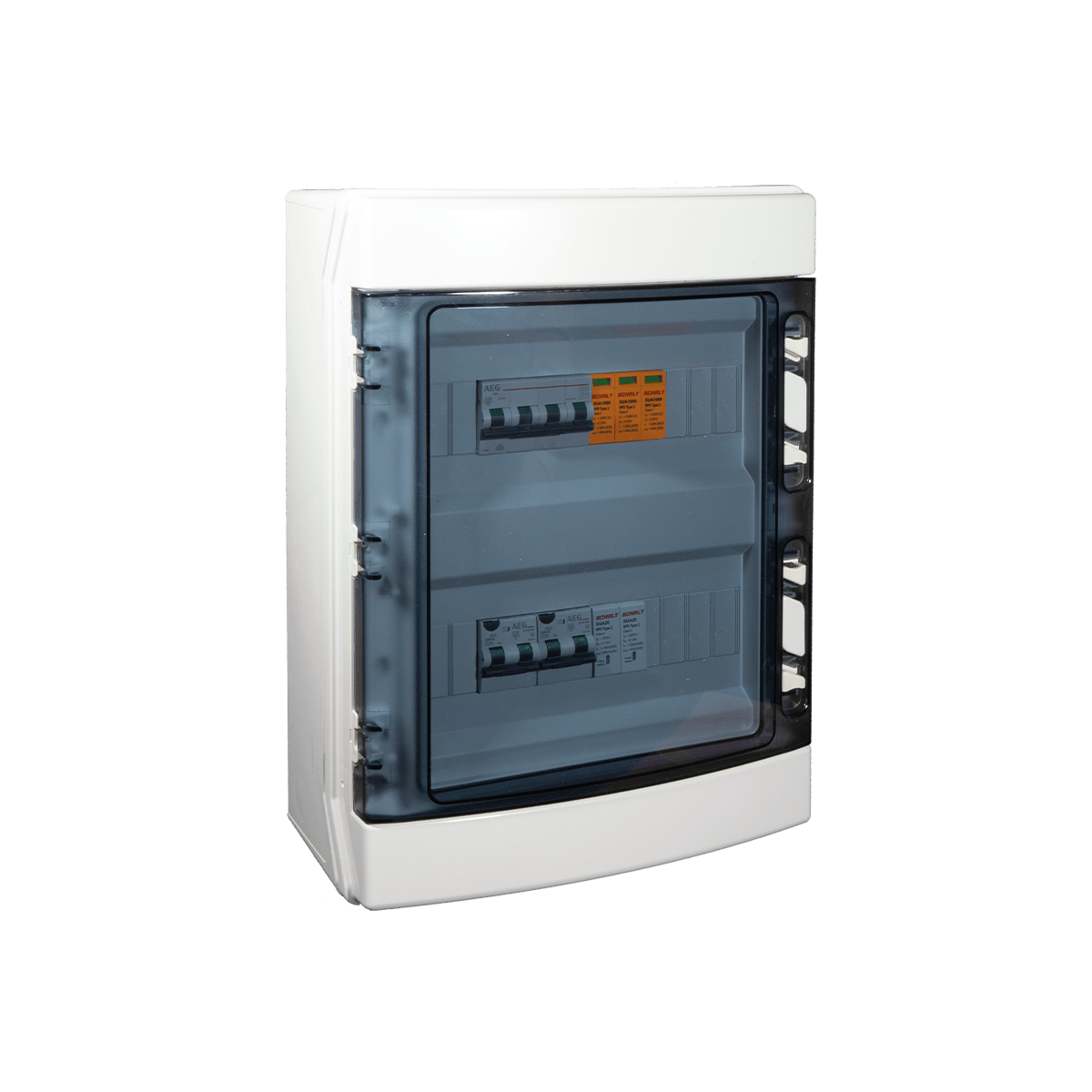 Quadro cablato AC/DC monofase per 2 stringhe dotato di componenti per la protezione completa dell'impianto fotovoltaico e contatore, dalla generazione alla distribuzione. Il quadro è composto da 1 interruttore magnetotermico differenziale 300mA 6kA curvaC, 1 scaricatore di Tipo 2 da 10kA, 1 interruttore magnetotermico 2P curva C, 1 interruttore magneotermico DC e 1 scaricatore Tipo 2 da 20kA. Tutta la componentistica è racchiusa all'interno di un contenitore in materiale plastico IP65-IK08 da 24 moduli DIN.