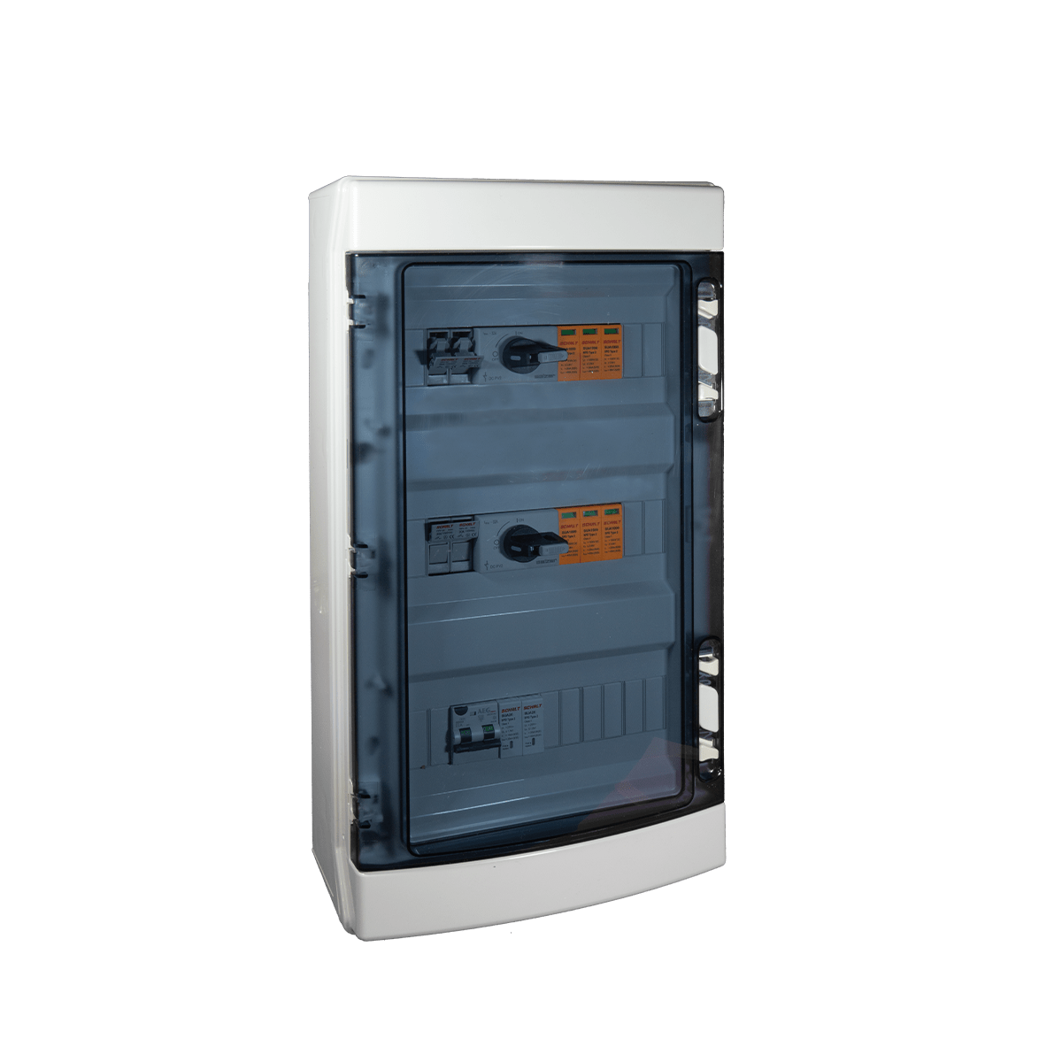 Quadro cablato AC/DC monofase per 2 stringhe dotato di componenti per la protezione completa dell'impianto fotovoltaico, dalla generazione alla distribuzione. Il quadro è composto da 1 interruttore magnetotermico differenziale 300mA 6kA, 1 scaricatore diTipo 2 da 10kA, 2 basi portafusibili, 2 sezionatori da 1000V e 2 scaricatore da 20kA. Tutta la componentistica è racchiusa all'interno di un contenitore in materiale plastico IP65-IK08 da 36 moduli DIN.