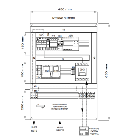 I quadri di interfaccia OPEN rappresentano una soluzione per la connessione di impianti fotovoltaici CEI 0-21. I quadri OPEN nascono con lo spazio e la predisposizione di cablaggio per gli interruttori di protezione inverter che saranno installabili successivamente tramite i collegamenti già forniti a corredo-Interruttore Generale 4x63A 15kA (EN60947-2) con bobina di sgancio per funzione di rincalzo-Relè di interfaccia NA003 con Ups di emergenza come da norma CEI 0-21-Contattore DDI 4 poli 37kW AC-3. Spazio per cablaggio Interruttori protezione inverter 3F+N: 1x33kW, 2x15kW (opppure 20kW+10kW), 3x10kW-Kit di cablaggio incluso nella confezione (3x25mm2 nero+1x25mm2 blu; 6x16mm2 nero+2x16mm2 blu) - Interruttori previsti 3F+N (da ordinare a parte):10kW DMA63NPC20/300; 12,5kW DMA63NPC25/300; 15kW DMA63NPC32/300; 20kW E94SC40+HD9532/300; 25kW E94SC50+HD9463/300; 33kW E94SC63+HD9463/300. Tutti i componenti sono racchiusi all'interno di un contenitore a parete in ABS IP54 LxHxP 700x500x250mm.