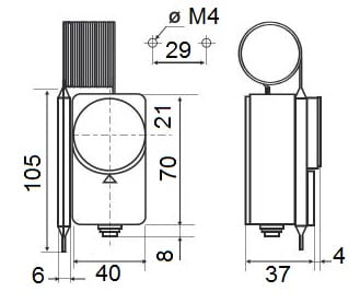 Termostati a capillare per la regolazione della temperatura di caldaie, impianti di condizionamento, impianti di refrigerazione, elettrodomestici, forni elettrici. Microinterruttore in commutazione a scatto rapido con contatti in AgCdO dorati.Tensione nominale d'isolamento Ui 380V~. Corrente nominale di servizio continuativo Ith 15A .Montaggio del corpo termostato a parete.Il bulbo con capillare può essere montato a distanza e fornito di tappi di tenuta o di guaine in rame con attacco Gc ½. Elemento sensibile con membrana in acciaio inossidabile.Bulbo e capillare in rame. Bulbo e capillare in rame stagnato per il tipo C04C2 e C04D2.Basetta in materiale termoplastico antiurto e autoestinguente V0.Uscita dei collegamenti elettrici con passacavo in PVC.Temperatura di immagazzinaggio e trasporto corrisponde alla temperatura ammissibile corpo termostato. Peso unitario 0,16 Kg.All'aumento della temperatura: apre 1-2 chiude 1-4.Funzionamento a dilatazione di liquido.