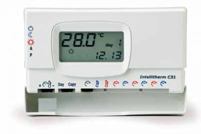 Cronotermostato elettronico a microprocessore, con programmazione settimanale per il comando di impianti di riscaldamento. Portata contatti 5(3)A 250V~. Software classe A. Microdisconnessione (1BU).Contatto in commutazione libero da tensione.Alimentazione con 3 pile a stilo tipo AA da 1,5V alcaline lunga durata senza connessioni alla linea elettrica.Intellitherm C31 viene fornito con uno zoccolo adatto per il montaggio a muro, interassi di fissaggio su scatole tonde 5 moduli (503). Collegamento all'utilizzatore con 2 fili. Montare il cronotermostato a 1,5 metri di altezza dal pavimento, lontano da cucine, fonti di calore, finestre e por te. * Un cursore per la scelta della temperatura, del giorno e degli orari di intervento giornalieri.* Un cursore per copiare la programmazione al giorno successivo e per passare al giorno successivo senza copiare la programmazione.* Un cursore per la scelta dell-ora in corso e del valore di temperatur * Un cursore laterale per la scelta del modo di funzionamento: AUTOMATICO, COMFORT, ECONOMY, ANTIGELO. * Temperatura ambiente* Ora in corso * Giorno in corso