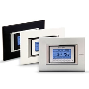 Cronotermostato elettronico a microprocessore, con programmazione settimanale per il comando di impianti di riscaldamento e di condizionamento. Il kit comprende: 3 cover colorate bianco, silver, antracite; 3 cover speciali per Bticino Axolute, Ave Sistema 44, Eikon Evo e Arkè bianco, silver, antracite; 3 coppie di adattatori colorati bianco, silver, antracite; 1 coppia di adattatori per BTicino Matix bianco; 3 telai per offrire compatibilità con le più diffuse placche.