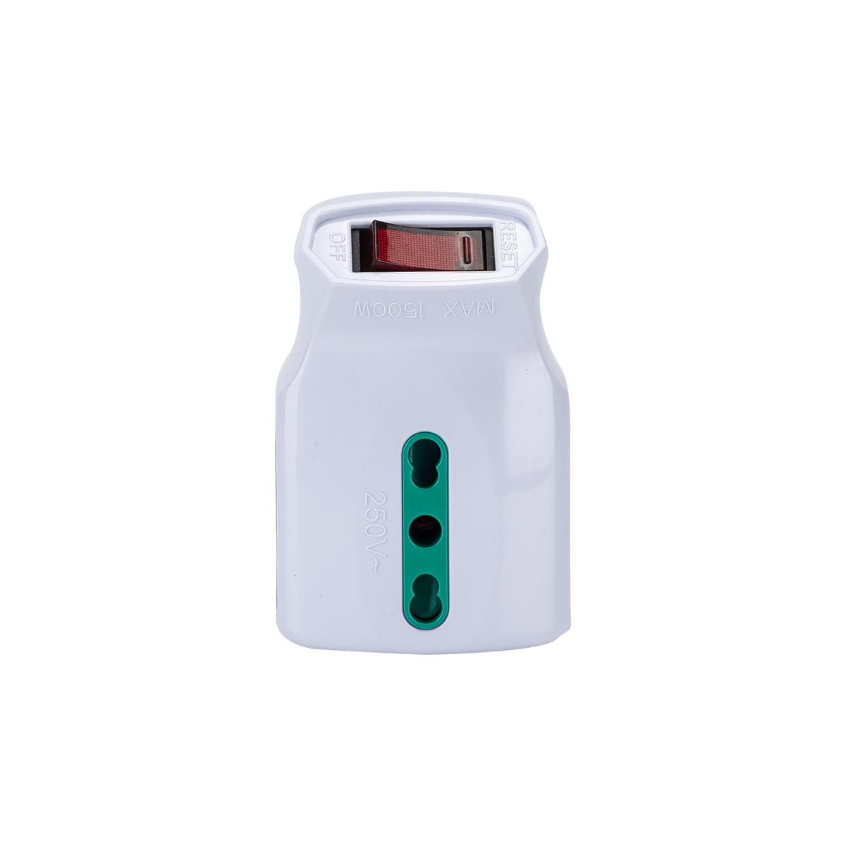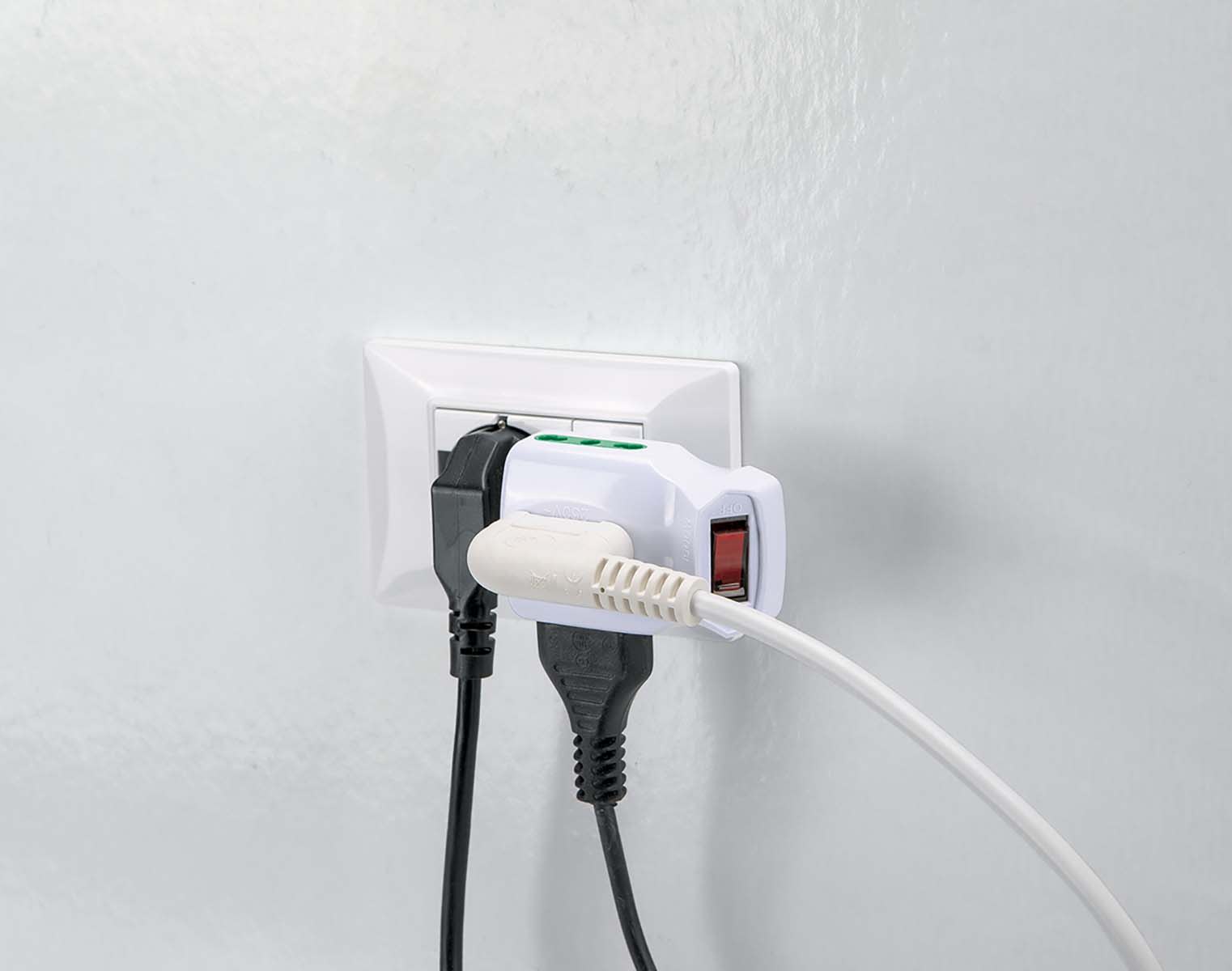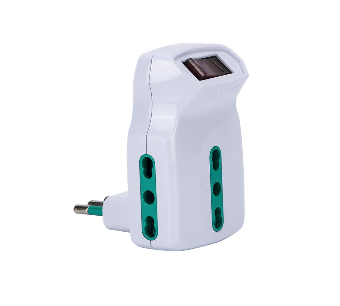 Adattatore triplo\nspina italiana 2P+T 10A\n3 prese bipasso italiane 2P+T 16A\n+ interruttore automatico di sovraccarico, colore bianco