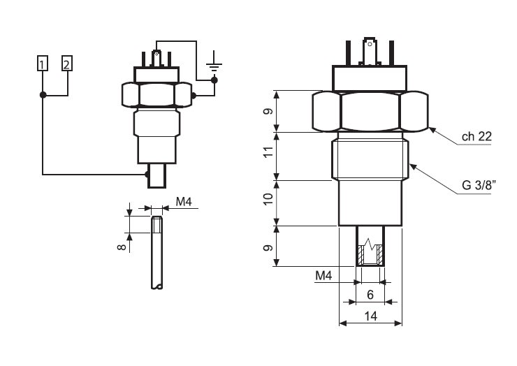 Portaelettrodo bipolare, un polo collegato all'elettrodo e uno per la massa collegato direttamente al supporto filettato in acciaio. Adatto per serbatoi in metallo e attacco filettato G3/8. (elettrodo non compreso). Temperatura massima del liquido 100°C,Massima pressione del serbatoio 12 bar, Pressacavi mm <6 ø mm, Materiale elettrodo: Acciaio inossidabile (AISI 316L).