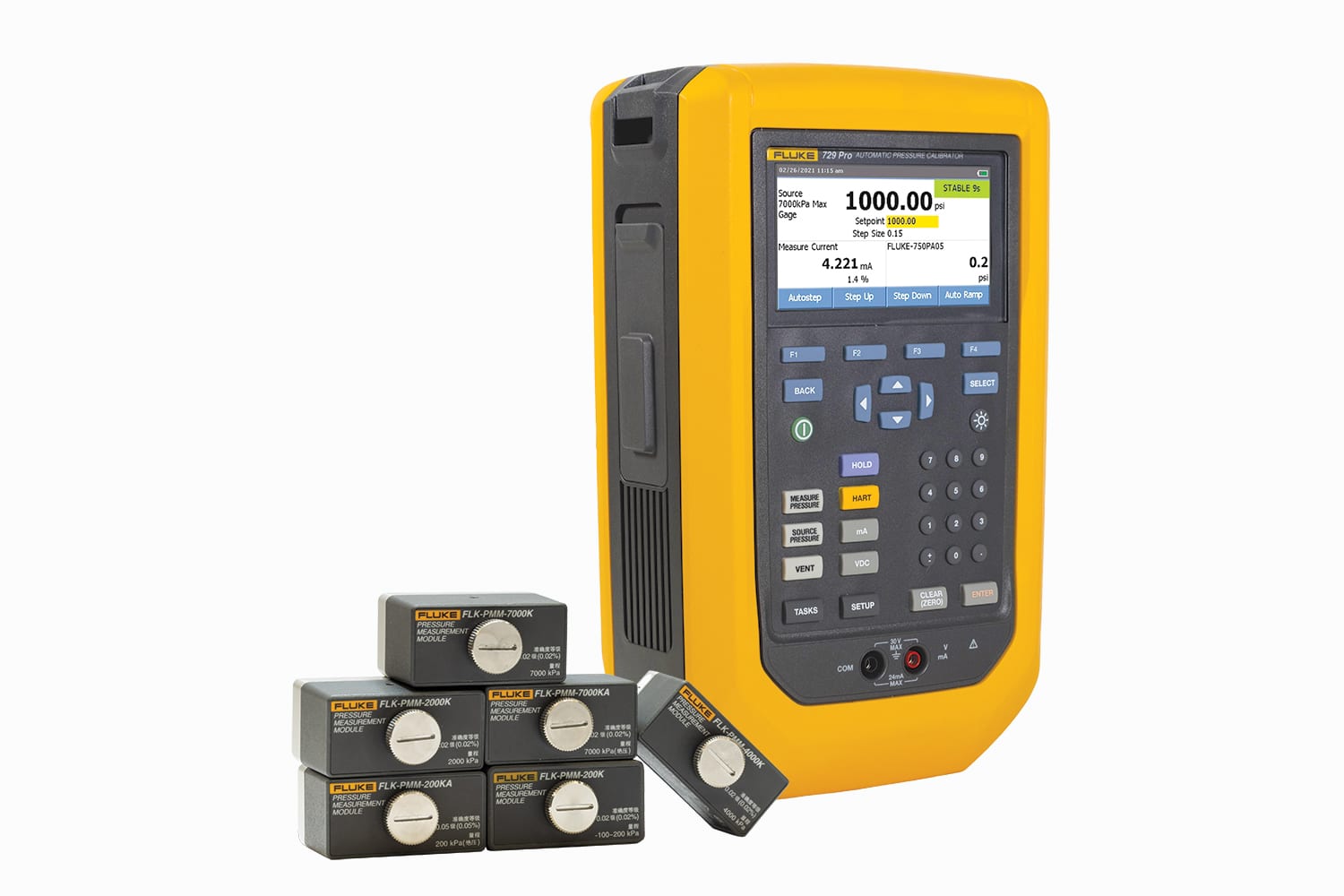 Il calibratore di pressione automatico Fluke 729 Pro 7M e uno strumento portatile di calibrazione della pressione per l'uso in laboratorio o sul campo. Questi calibratori di pressione automatici coprono un ampio intervallo di pressione fino a 1.000 psi. Il 729Pro, con la sua pompa elettrica integrata a capacita piu elevata, e inoltre molto piu veloce rispetto al Fluke-729 standard.