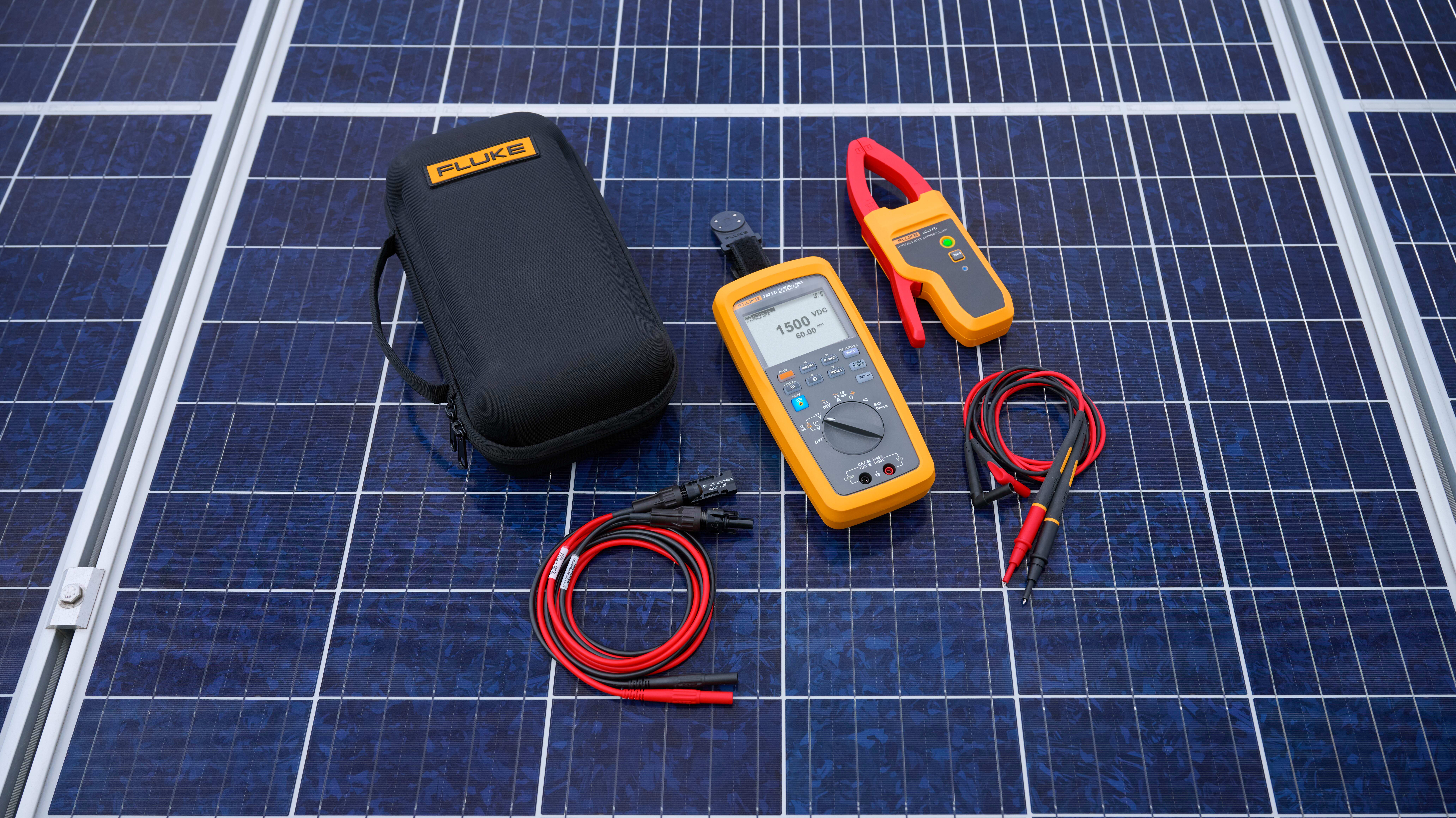 Il multimetro digitale Fluke 283 FC a vero valore RMS CAT III 1500 V/CAT IV 1000 V e la pinza amperometrica wireless a283 FC a vero valore RMS rappresentano la perfetta combinazione per la ricerca guasti per i tecnici che lavorano in ambienti in correntecontinua con tensioni fino a 1500 V. Fluke 283 FC, utilizzabile per eseguire la ricerca guasti sul campo su array fotovoltaici di livello industriale, impianti eolici, ferrovie elettriche o data center, è progettato per incrementare la sicurezza e la produttività, fornendo risultati accurati, affidabili e ripetibili. Fluke 283 FC/PV include accessori di sicurezza CAT III 1500 V CC per l'utilizzo professionale senza compromessi in materia di sicurezza. I puntali Staubli MC4 consentono di realizzare rapidamente connessioni affidabili e sicure a moduli o stringhe per testare la tensione CC fino a 1500 V CC. I puntali in silicone TL175-HV classe CAT III 1500 V/CAT IV 1000 V offrono maggiore flessibilità durante i test di tensione, millivolt, resistenza, continuità o capacità su inverter, combiner box, array fotovoltaici o singoli moduli fotovoltaici. Grazie al luminoso display retroilluminato e ai pulsanti illuminati, è più facile lavorare in varie condizioni di illuminazione, e il kit di aggancio magneticoin dotazione consente di tenere le mani libere durante la ricerca guasti. La custodia rigida personalizzata in dotazione protegge il dispositivo durante il trasporto.