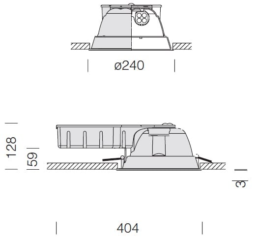 Corpo: In policarbonato infrangibile ed autoestinguente V2, stabilizzato ai raggi UV, antingiallimento. Riflettore: In policarbonato, autoestinguente V2, metallizzato con polveri di alluminio, in alto vuoto con procedimento di C.V.D. per un maggior controllo e rendimento della luce. Portalampada: In policarbonato e contatti in bronzo fosforoso. Equipaggiamento: Accessori elettrici posti lateralmente rispetto al corpo in una cassetta in policarbonato con feritoie di raffreddamento.