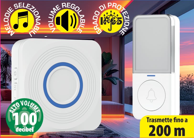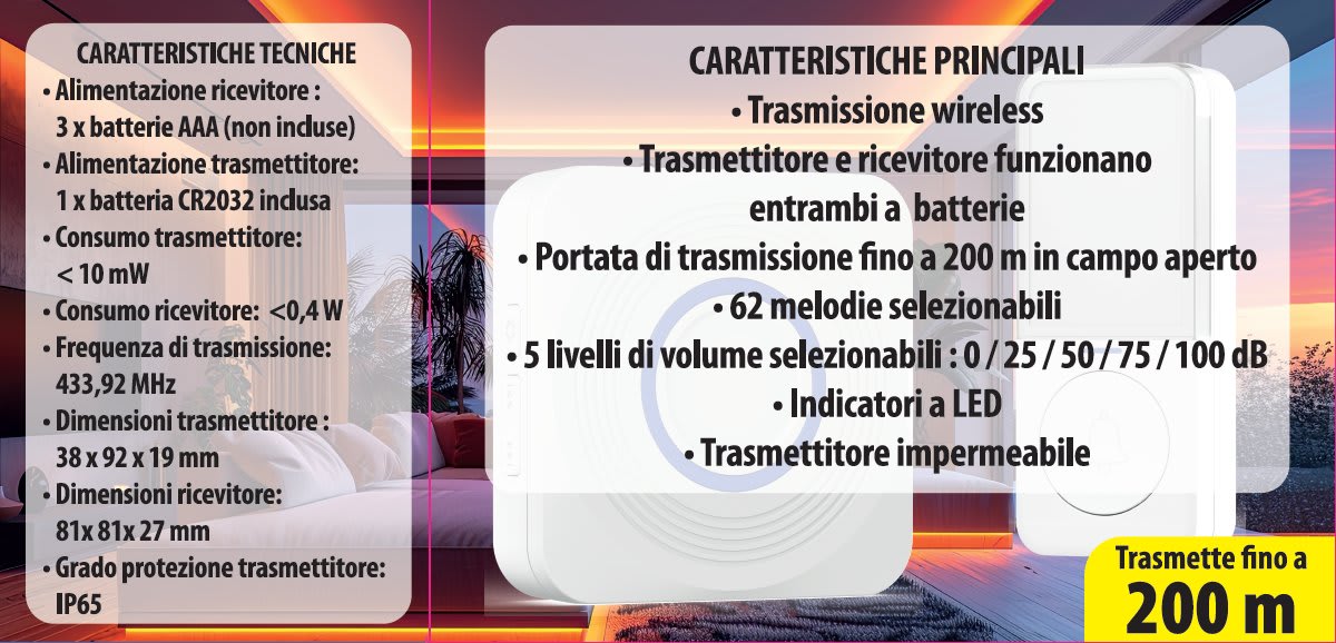 CAMPANELLO WIRELESS, FACILE DA INSTALLARE. SIA IL TRASMETTITORE CHE IL RICEVITORE FUNZIONANO A BATTERIA; PORTATA OPERATIVA: 200M IN ARIA APERTA 52 MELODIE DA SCEGLIERE; CONTROLLO DEL VOLUME A 4 LIVELLI (25DB-100DB) INDICATORE LED PULSANTE PUSH IP56 IMPERMEABILE; CON CONNETTORE DI TIPO C PER L'ALIMENTAZIONE. CODICE DI APPRENDIMENTO AUTOMATICO, FACILE DA FARE DA SOLI SENZA INTERFERENZE. UN RICEVITORE PUÒ ACCOPPIARSI CON 8 TRASMETTITORI, UN TRASMETTITORE PUÒ ACCOPPIARSI CON MOLTI RICEVITORI, SENZA LIMITI.
