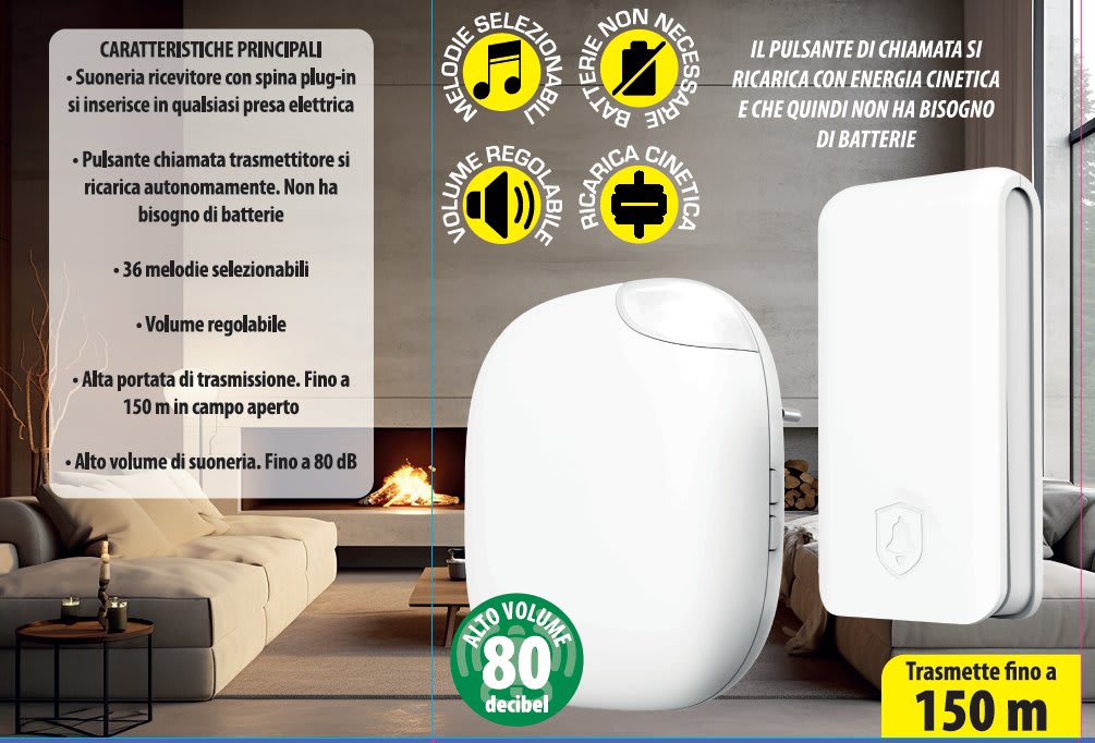 CAMPANELLO SENZA FILI KINETICO NON È NECESSARIA ALCUNA BATTERIA NÉ PER IL RICEVITORE NÉ PER IL TRASMETTITORE, PIÙ ECOLOGICO. IL TRASMETTITORE AUTOALIMENTATO CONVERTE L'ENERGIA CINETICA IN UN SEGNALE ELETTRICO. DISTANZA DITRASMISSIONE FINO A 100 METRI IN ARIA APERTA, FREQUENZA 433MHZ. IL RICEVITORE È DOTATO DI LUCE INDICATRICE A LED. LA DURATA DEL PULSANTE CINETICO È FINO A 100.000 PRESSIONI, GARANTENDO AFFIDABILITÀ PER ANNI DI UTILIZZO. IL DESIGN UNICO DELLA STRUTTURA DI DRENAGGIO E IL RIVESTIMENTO IMPERMEABILE POSSONO RESISTERE ALLA PIOGGIA INTENSA, CONTINUANDO A FUNZIONARE NORMALMENTE ANCHE SE CADE IN ACQUA. MASSIMO 4 TRASMETTITORI POSSONO ESSERE COLLEGATI A 1 RICEVITORE. CONFORME ALLE NORMATIVE CE E RoHS. ALIMENTAZIONE (RICEVITORE): 100-240V/50-60HZ. TEMPERATURA DI LAVORO: DA -20° A +50°. VOLUME DEL CAMPANELLO: CIRCA 80DB.