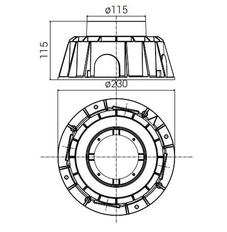 Passum Up Ø 125 - Cassaforma. Cassaforma in tecnopolimero a perdere. Dimensione: D2: Ø230 mm. D1: Ø115 mm. H: 115 mm. Incasso a terra o parete.