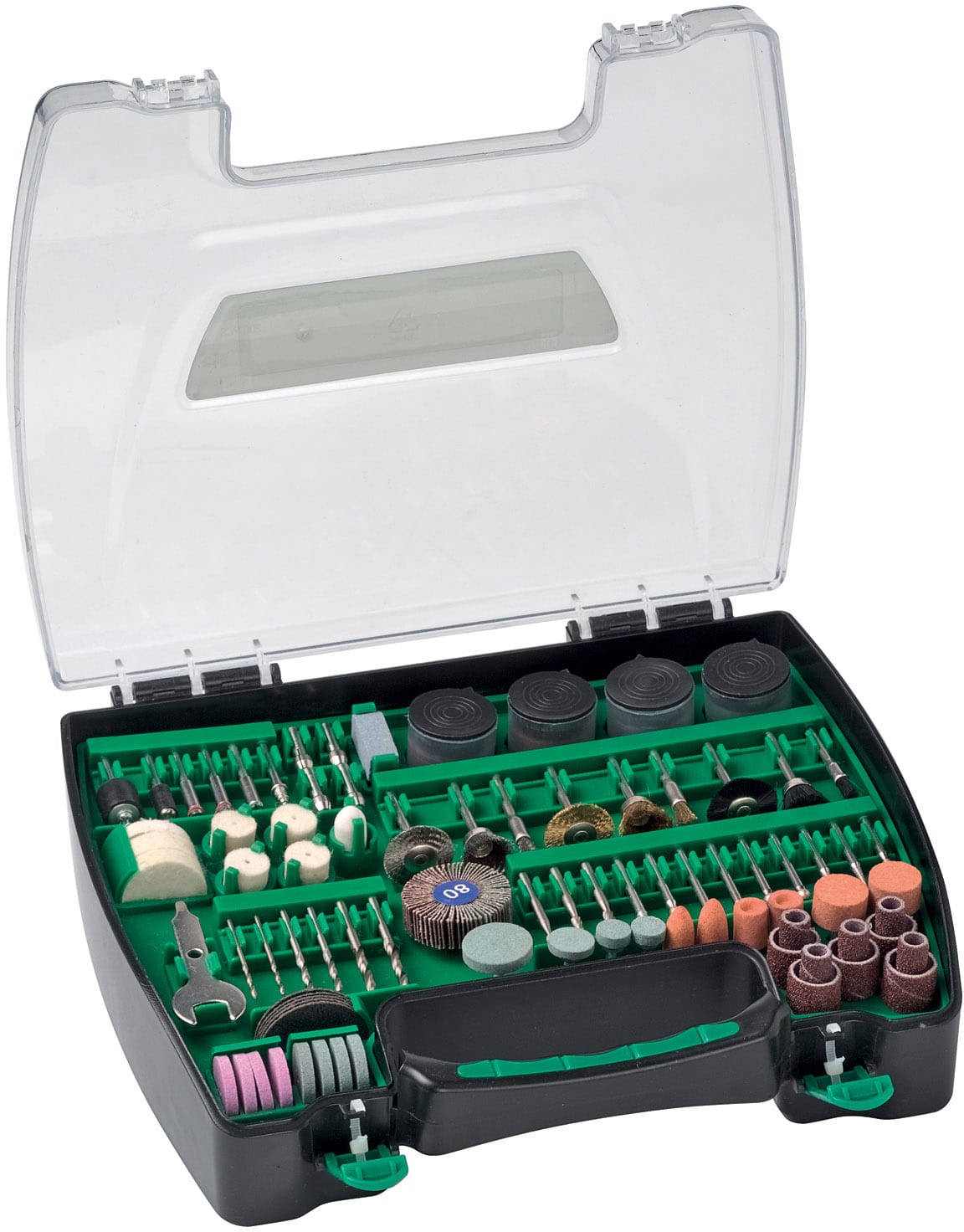 Accessori per smerigliatrice assiale- GP10DL,confezione composta da 200 articoli n° 10 cilindri per levigare n° 1 disco in panno n° 6 feltri per lucidare n° 1 punta portafeltri n° 6 punte in HSS 2 per tipo: 2 x 1,6 - 2 x 2,4 - 2 x 3,2 mm n° 2 gambi portacilindri n° 9 dischi da taglio diamantati n° 3 dischi da taglio in HSS n° 6 mole all’ossido di alluminio con gambo n° 4 mole all’ossido di alluminio n° 4 mole al carburo di silicio con gambo n° 4 mole al carburo di silicio n° 3 spazzole in nylon n° 3 spazzole in acciaio n° 3 spazzole in ottone n° 1 confezione di pasta per lucidare n° 66 dischi da taglio n° 52 dischi abrasivi n° 4 mandrini cromati n° 4 mandrini n° 5 dischi da taglio in fibra di vetro n° 1 chiave n° 1 mola lamellare n° 1 pietra pomice