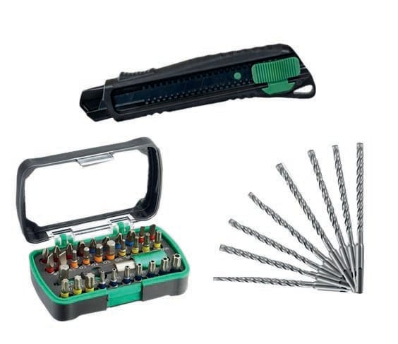 il kit accessori HTAKIT0002 comprende 2 Punte SDS-plus 4 Taglienti - d.6,0x115 mm 2 Punta SDS-plus 4 Taglienti - d.6,0x165 mm 2 Punta SDS-plus 4 Taglienti - d.8,0x165 mm 1 Punta SDS-plus 4 Taglienti - d.10,0x165 mm 1 Punta SDS-plus 4 Taglienti - d.12,0x165 mm 1 Kit inserti da 32 articoli lung. 25 mm 1 Cutter in ABS+gomma da 25m