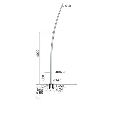 Palo conico curvo, H 6000mm. Palo di geometria conica curva, realizzato in acciaio zincato a caldo 70 micron come da normativa UNI EN ISO 1461 (EN 40-5), sottoposto a trattamento di verniciatura a polvere texturizzata RAL 9007. Il palo è costituito da un unico tubo metallico; è in acciaio EN10025-S235JR, ha un diametro alla base 147 mm e ø70 all’estremità superiore, spessore 3 mm e altezza 6000 mm f.t. L'asola per la portella è dimensiona a 400x90 mm, ad altezza 800 mm dal terreno, idonea per il montaggio della morsettiera a due fusibili (cod. 1863). Il palo permette l'istallazione di morsettiere italiane (grado di protezione IP44 IK08), francesi, spagnole (solo piccole), inglesi (con adattatore in legno marino cod. BZC2 da ordinare separatamente) e tedesche/svizzere (tramite guida DIN cod. B943 da ordinare separatamente).Portella a filo, realizzata in acciaio IP30, con relativa chiave per la portella (cod. 0246); la chiusura è assicurata tramite una guarnizione di tenuta che si adatta alle irregolaritàsuperficiali del palo. Nella parte superiore del palo è saldato un codolo ø60mm per il fissaggio del proiettore. All’altezza di 4000mm è saldato un codolo ø60 per l’installazione della versione intermedia. La piastra di ancoraggio per il supporto del palo è in acciaio zincato a caldo 70 micron; ha geometria quadrata, dimensioni 400x400 mm e spessore 20 mm. Le 4 asole, con interasse di 300x300 mm, permettono il passaggio dei tirafondi di fissaggio.Il palo è assicurato alla piastra tramite saldatura alla base. I tirafondi in acciaio, lunghi 500 mm e con diametro 24 mm, sono bloccati tramite viterie in acciaio.