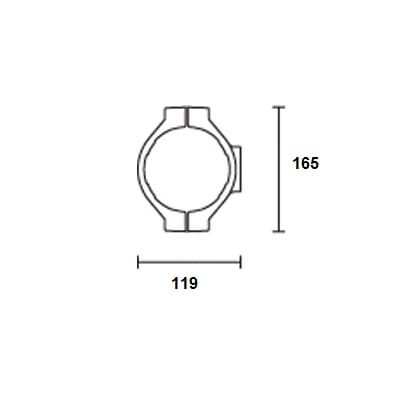 Flangia finalizzata al fissaggio di un proiettore Maxiwoody corpo piccolo o medio su palo cilindrico ø102mm. Realizzata in pressofusione di alluminio e verniciata con trattamento superficiale di verniciatura liquida texturizzata. La flangia può essere installata su qualunque palo con diametro ø102mm senza operazioni di foratura per il fissaggio meccanico. Consente la rotazione completa del proiettore Maxiwoody in ogni direzione, grazie alla combinazione delle rotazioni tra proiettore e staffa (continua) e delle rotazioni tra staffa e flangia (360°). L'installazione è garantita da viterie e dadi in acciaio inox. Sulla flangia sono presenti sedi esagonali per l'antirotazione dei dadi. Cablaggio: Il cavo di alimentazione fuoriesce dal palo tramite il passaggio in un passacavo con foro da d=15mm.