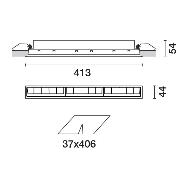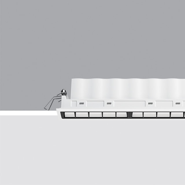 Apparecchio miniaturizzato lineare ad incasso per sorgenti LED. Sistema ottico asimmetrico specializzato per ottenere una efficace distribuzione sulla parete, evitando zone d’ombra in prossimità del soffitto. Il telaio perimetrale in policarbonato nero è progettato per attenuare sensibilmente l’effetto di abbagliamento longitudinale. Corpo principale con superficie radiante in alluminio pressofuso, versione con cornice perimetrale di battuta. Recuperatore di flusso / riflettore in alluminio superpuro -schermo in PMMA con texture. Fornito con unità di alimentazione collegata all’apparecchio. 31W. 3050 lm. 4000K. DALI
