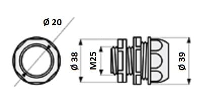Pressatubo autoestinguente per il raccordo di tubi rigidi o corrugati a scatola, con filettatura metrica passo 1,5 mm. Diametro 25 mm. In materiale a base di PVC rigido grigio RAL 7035, garantisce protezione IP64 con tubi corrugati pieghevoli e IP67 con tubi rigidi. Resistente UV. GWT 850°C (EN 60695-2-11). Classificato autoestinguente UL94 V0, garantisce sicurezza e affidabilità negli impianti elettrici.