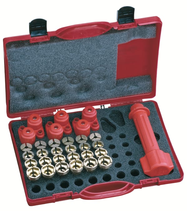 Set adattatori D8 mm per apparecchiature elettrotecniche. Indicato come adattatore per il collegamento di apparecchiature elettrotecniche (es: dispositivo shunt, prelievo corrente, cavo di collegamento, ecc.) su teste esagonali o cilindriche. Caratteristiche: • Fissaggio a morsa tramite manopola isolata • Possibilità inserimento di vari inserti per il collegamento • Resistente ad un carico equivalente a 200 A per 60 min. o 250 A per 15 min. • Tensione nominale fino a 600 V AC/DC (50-60 Hz) • Resistenza acortocircuito di 8 kA per 0,2 sec. o 1,3 kA per 60 sec. • Paramano in accordo con la norma EN CEI 60900 Dotazione: • 1 manopola isolata • 2 morsetti isolati • 2 set di inserti esagonali tipo 13/17/19 mm • 2 inserti per spinotto D6
