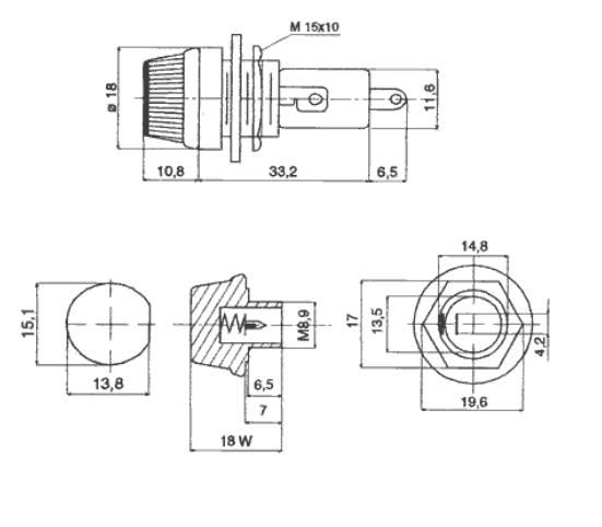 In materiale termoplastico autoestinguente, per montaggio a pannello. Sono forniti senza fusibile. Montaggio: da incasso. Corpo: in materiale termoplastico. autoestinguente. Contatti: ottone nichelato. Esec. tappo: a vite. Esec. colleg.: a saldare. Dimensioni fusibile: 6,3x32 mm
