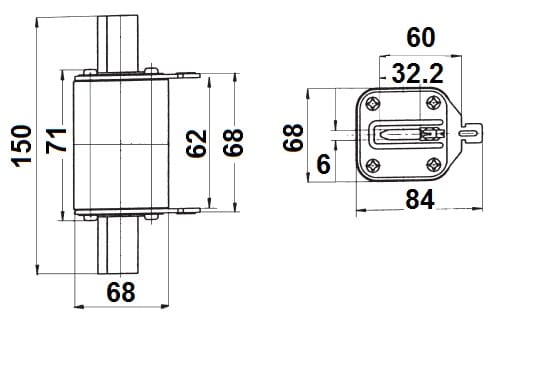 Corpo in steatite ad alta resistenza termica e meccanica, con ampia camera per l’estinzione dell’arco. Gli elementi fusibili sono in rame argentato saldati alle lame del contatto. L’elemento estinguente dell’arco è sabbia di quarzo. Per protezione di semiconduttori.