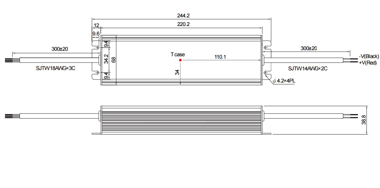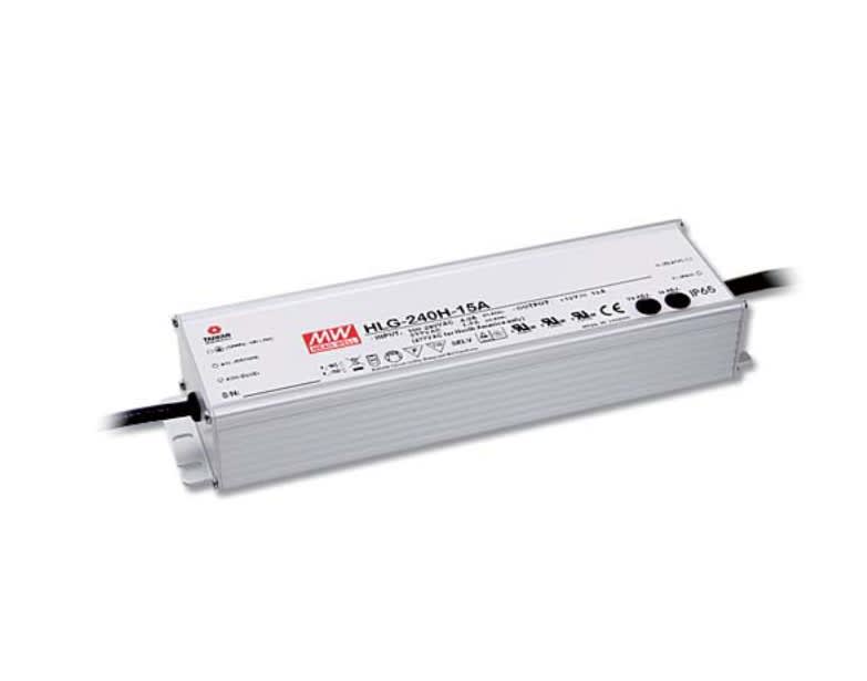 Alimentatore LED 90—305V 47—63Hz 127—431Vdc 240W 24VDC. Dimensioni: 245x68x39 mm. IP67.