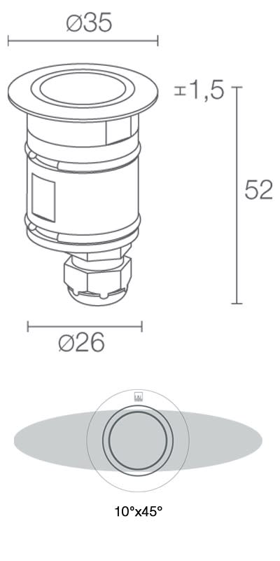 Incasso uplight da esterno (non adatto per immersione); a incasso (soffitto, parete, pavimento); corpo e ghiera in acciaio inox AISI 316L, schermo in vetro trasparente temprato, schermo in vetro acidato temprato (ottica diffusa). 2W. 88 lm. Blu. Diffuso