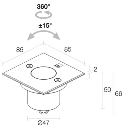 Incasso da esterno (non adatto per immersione in piscine e fontane); a incasso (soffitto, parete, pavimento); 3,5W. Flusso sorgente: 184 lm. 3000 K. 20°. Colore inox