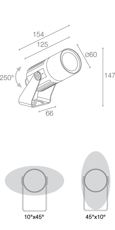 Proiettore da interno ed esterno; su superficie (soffitto, parete, pavimento, picchetto); corpo in alluminio anticorodal lega 6082, schermo in vetro extrachiaro trasparente temprato serigrafato. 7W. 3000 K. 9°. Colore Bianco