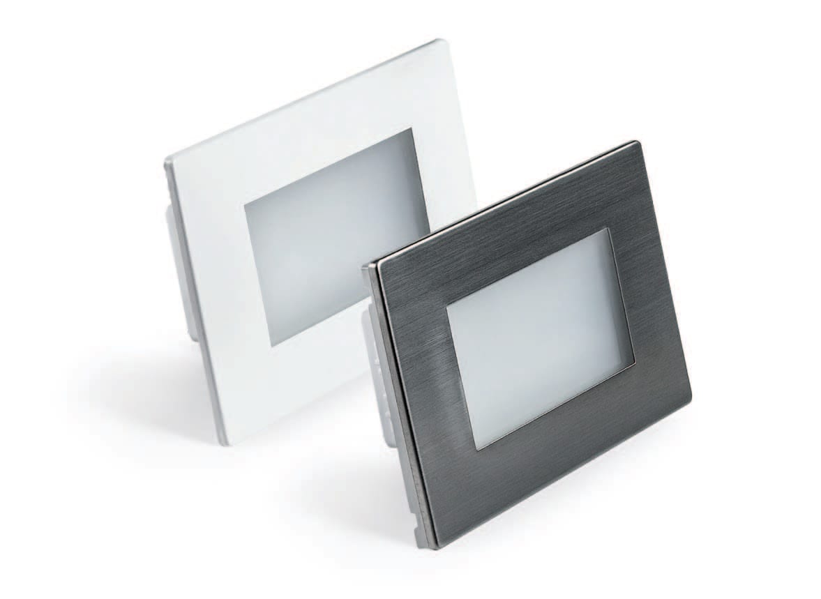 Segnapasso LED rettangolare da incasso 3W per scatole standard "503" in metallo e policarbonato. Dispositivo salva blackout (SA+SE). Nr. 2 Flange: Bianca - Inox, molle per montaggio senza scatola, Batteria integrata sostituibile incluso. Tempo di ricarica 5h. Autonomia batteria 3h. Cassaforma 503 non incluso. LED 3W 200lm 4000K CRI >80 - 120°. Finitura: acciaio inox / bianco.