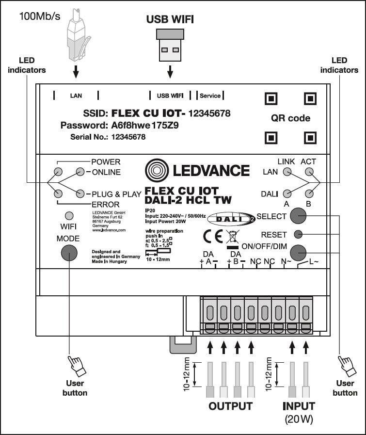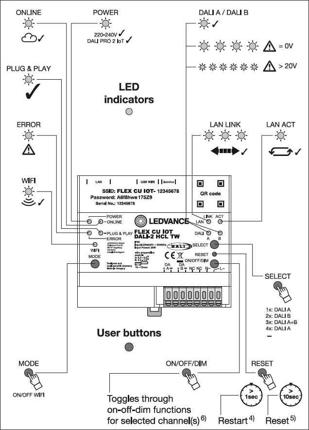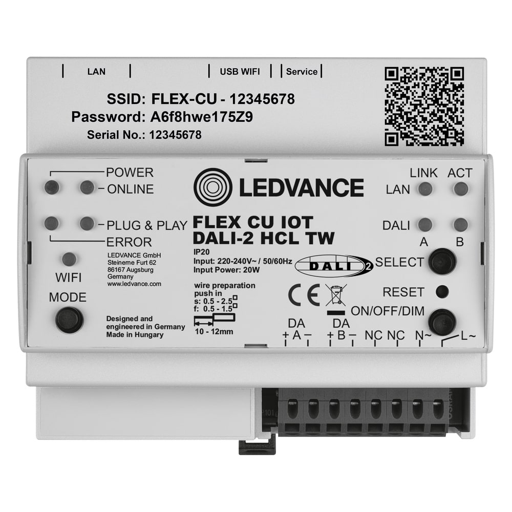 Centralina di controllo per un massimo di 128 luci e fino a 126 sensori/accoppiatori pulsanti. Caratteristiche del prodotto: Centrale certificata DALI-2 per un massimo di 128 luci e 126 accoppiatori sensori-pulsanti. IoT-ready con gateway integrato per l'accesso da remoto dei dati. Compatible with LEDVANCE DALI IoT WEB UI and DALI IoT CONFIG software. Integrazione di Building Management System tramite interfaccia KNX (opzionale). Messa in servizio tramite Ethernet/WLAN. Fattore di forma ridotto: solo 6 TE (binario DIN). Lunghezza del cavo di controllo DALI: fino a 300 m. Vantaggi del prodotto: Certificato DALI-2 per una migliore interoperabilita multi-vendor. BIOLUX Human Centric Lighting per una luce naturale di alta qualita durante il giorno negli uffici. Accesso da remoto per modifiche all'impianto da ogni postazione. Interconnessione LAN per connettere fino a 8 controller in una rete. Rest API for connection of a 3rd party Cloud with the FLEX CU IOT DALI-2 HCL TW Controller. Adatto per VIVARES Cloud Services (opzionale). Aree di applicazione: Illuminazione di aree fino a 1000 mq con una sola unita di controllo. Controllo della stanza e del piano. Collegamento di sensori di luce e presenza per il controllo automatizzato della luce. Applicazioni RGB e Tunable White. Apparecchiatura / Accessori: App per iOS e Android disponibile gratuitamente nell'App Store.