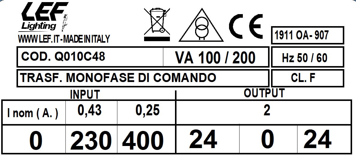 LEF LIGHTING SRL - LEFQ010C48 T.M. 100VA 230.400V / 24.0.24V - Q010C48