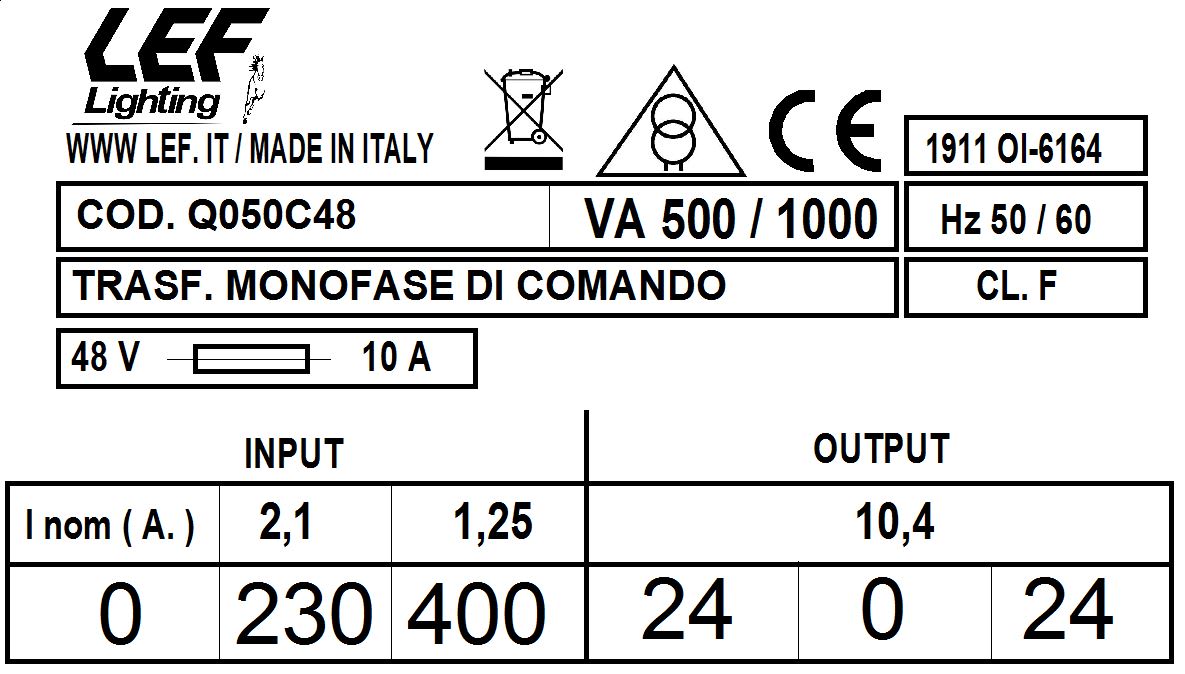 LEF LIGHTING SRL - LEFQ050C48 T.M. 500VA 230.400V / 24.0.24V - Q050C48