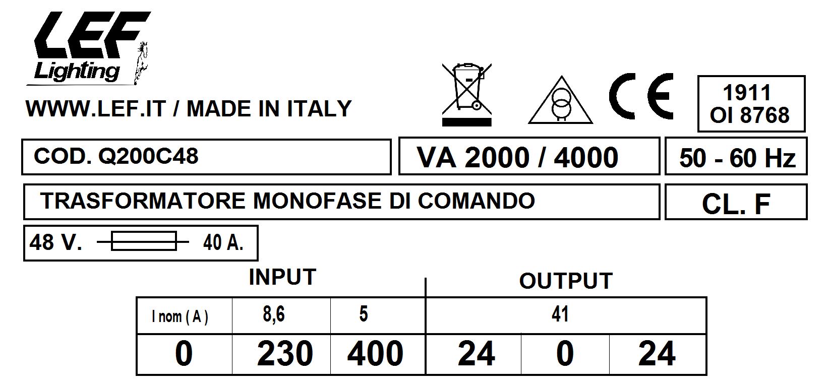 LEF LIGHTING SRL - LEFQ200C48 T.M. 2000VA 230.400V / 24.0.24V - Q200C48