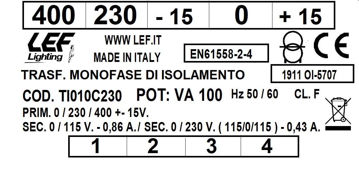 LEF LIGHTING SRL - LEFTI010C230 T.M. 100VA 230.400V / 115 230V - TI010C230