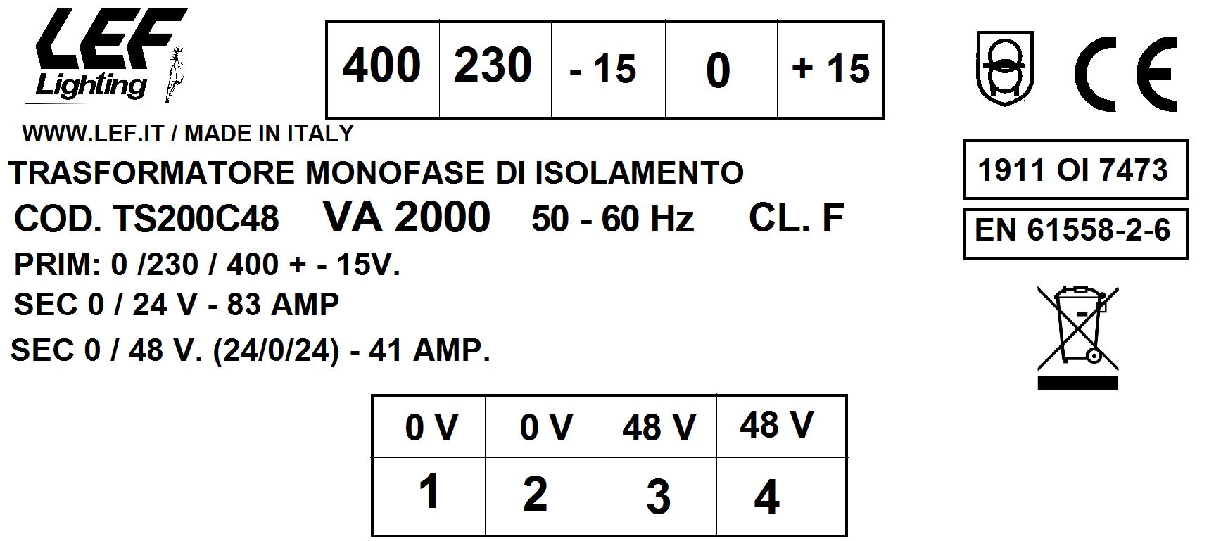 LEF LIGHTING SRL - LEFTS200C48 T.M. 2000VA 230.400V / 24 48V - TS200C48
