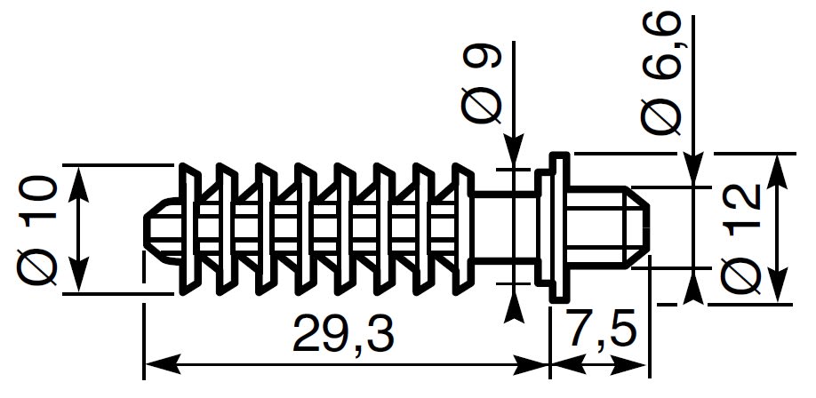 Tassello a vite con testa filettata diametro 6,6 mm. Diametro del foro 8 mm.