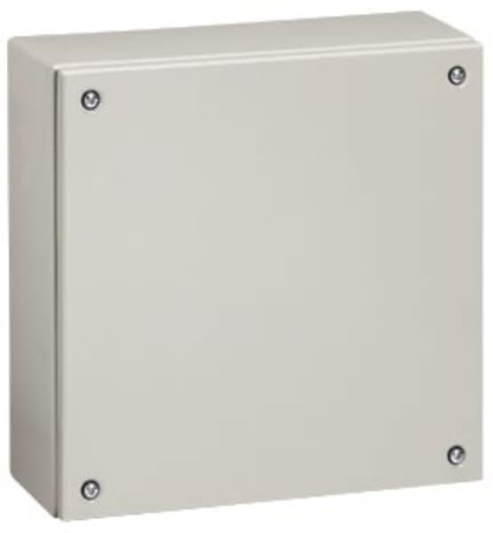 Cassette di derivazione metalliche 400 x 400 x 120 mm. Cassette in lamiera d’acciaio spessore 9/10um. Fissaggio del coperchio con viti antisfilamento. Verniciatura poliestere RAL 7035. Equipaggiate con 2 montanti verticali preforati Grado di protezione IP66 secondo EN 60529 e IK10 secondo EN 50102.