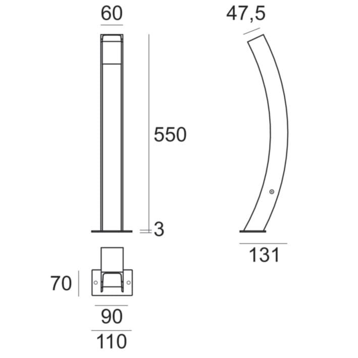 Paletti e teste palo a singola emissione per applicazione outdoor. La sorgente luminosa LED, di colore bianco caldo, con distribuzione luminosa General Lighting, è composta da 4 LED powerled, con una CCT 3000 K ed un CRI 80; il flusso luminoso della sorgente è di 935 lm, con un'efficienza nominale di 133.6 lm/W. Il corpo dell'apparecchio, realizzato in alluminio 6060, presenta una finitura di colore dark brown, ottenuta tramite anodizzazione poro aperto + verniciatura a polvere; il diffusore è prodottoin policarbonato uv resistente. Il grado di protezione è IP65; il peso complessivo è di 1,78 kg. La potenza assorbita dall'apparecchio è di 7 W.