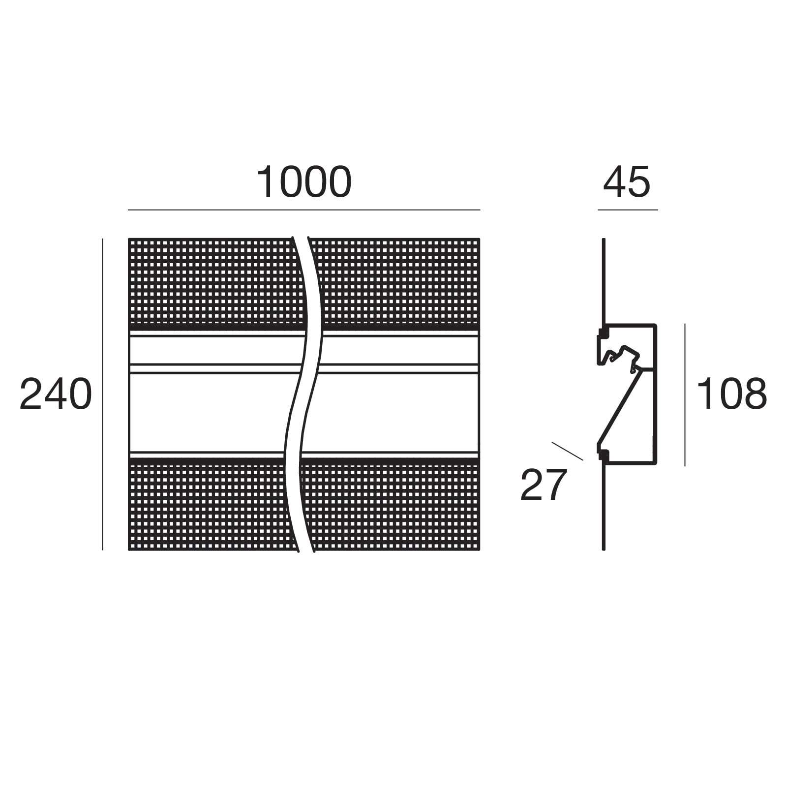Sistemi e elementi lineari a singola emissione per applicazione outdoor.Il corpo dell'apparecchio, realizzato in alluminio, presenta una finitura di colore alluminio anodizzato, ottenuta tramite anodizzazione. il peso complessivo è di 1.63 kg.ed è installabile a parete, con foro rettangolare con misura 1000 x 110 mm (nel cartongesso).Conforme alla norma EN 60598-1 e alle relative prescrizioni particolari.