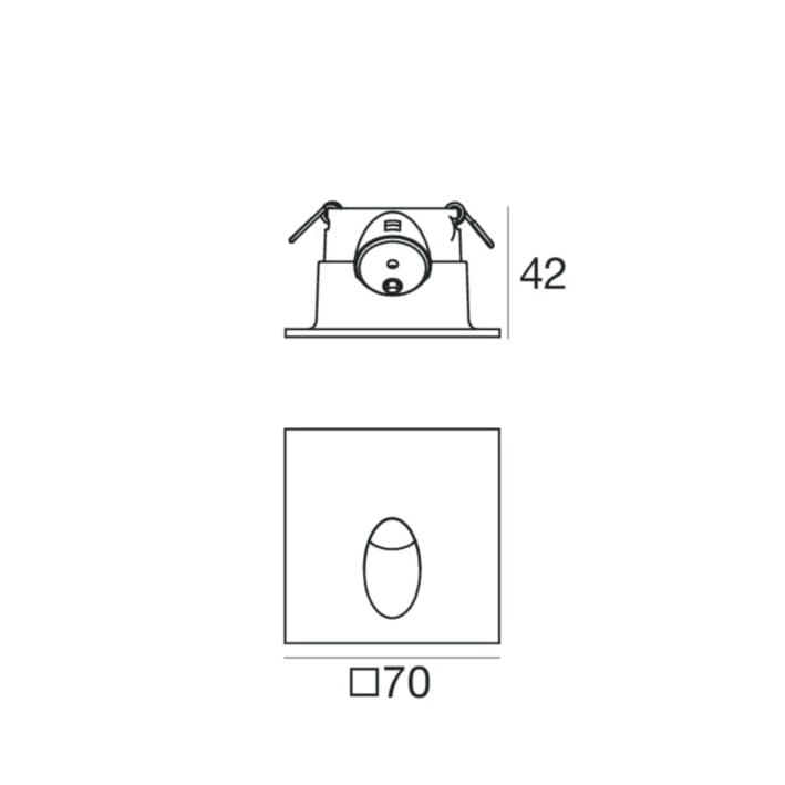 Lampada a parete a singola emissione per applicazione outdoor. La sorgente luminosa LED, di colore bianco caldo, con distribuzione luminosa Wide Flood, è composta da 1 LED powerled, con una CCT 3000 K ed un CRI 80; il flusso luminoso della sorgente è di 233 lm, con un'efficienza nominale di 116.5 lm/W.
