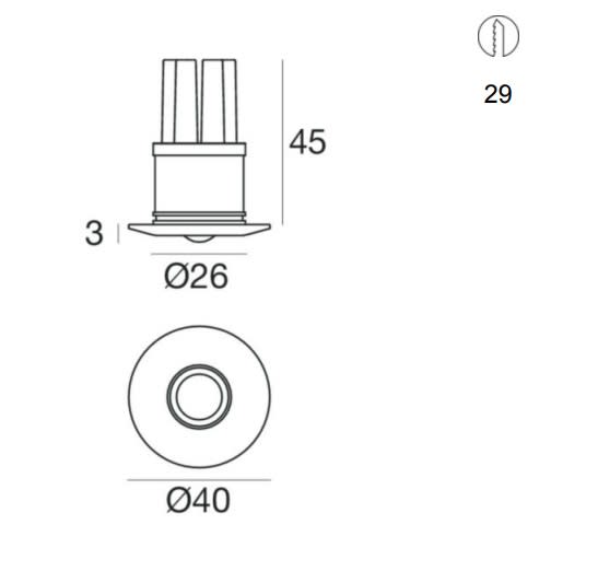 Downlights a singola emissione per applicazione indoor. La sorgente luminosa LED, di colore super caldo, con distribuzione luminosa Flood, è composta da 1 LED powerled, con una CCT 2700 K ed un CRI 80; il flusso luminoso della sorgente è di 219 lm, con un'efficienza nominale di 109.5 lm/W.