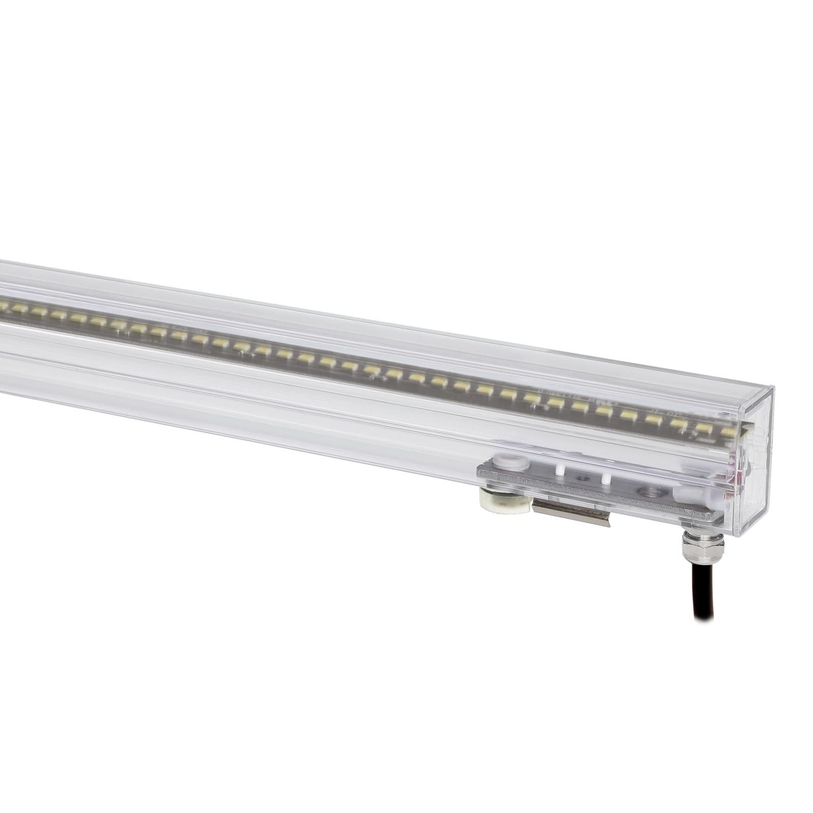 Elementi lineari a singola emissione per applicazione outdoor. La sorgente luminosa LED, di colore bianco caldo, con distribuzione luminosa Asymmetric Wallwasher, è composta da 120 LED topled, con una CCT 3000 K ed un CRI 80; il flusso luminoso della sorgente è di 720 lm, con un'efficienza nominale di 120.0 lm/W. Il corpo dell'apparecchio, realizzato in policarbonato uv resistente, presenta una finitura di colore trasparente; il diffusore è prodotto in policarbonato uv resistente. Il grado di protezioneè IP67; il peso complessivo è di 0.45 kg. La potenza assorbita dall'apparecchio è di 6 W.