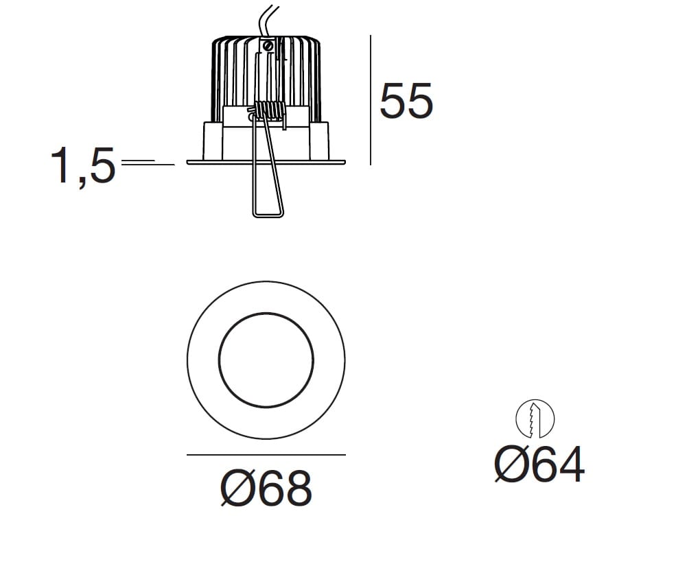 L'apparecchio presenta una classe di isolamento III ed è installabile a soffitto, con foro tondo di diametro 64 mm (nel cartongesso).