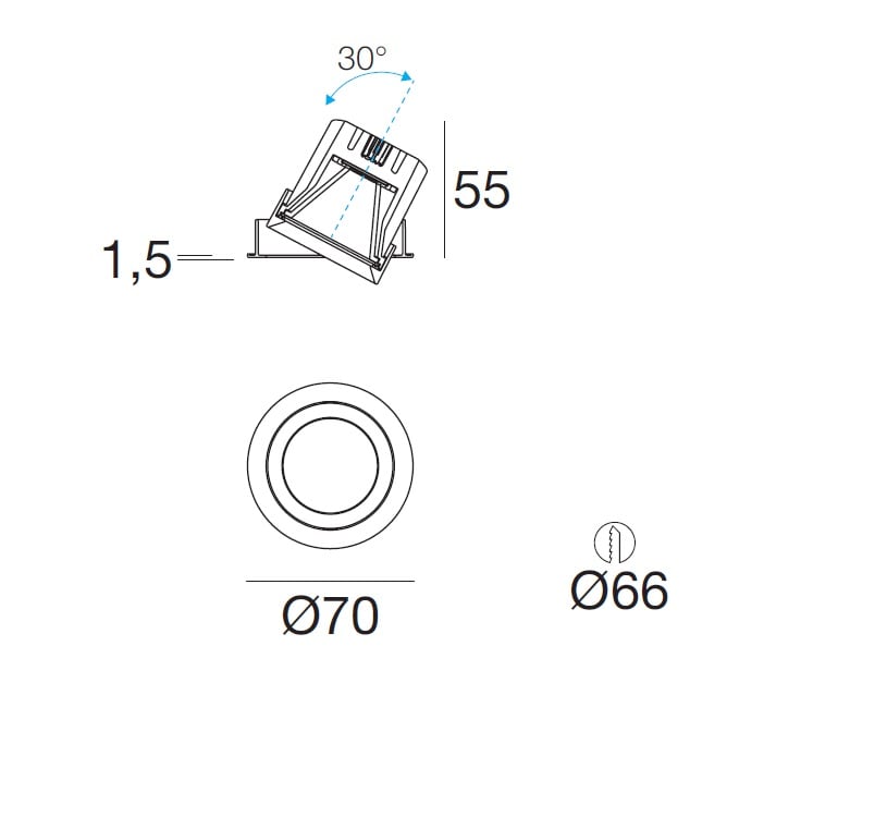 L'apparecchio presenta una classe di isolamento III ed è installabile a soffitto, con foro tondo di diametro 66 mm (nel cartongesso).