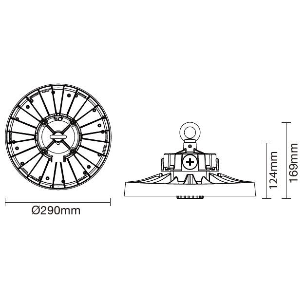 Kong, High Bay, ?290*169mm, ON/OFF, 150W, Dip-switch 2CCT 4000K/5000K, 22500LM, 150lm/W, UGR<31, 220-240V, IP66F, IK08, BA120, SDCM<5, -30?C~50?C, &100.000h L70B050, 5 anni di garanzia, Classe I, Nero, Lente PC + Alloggiamento in alluminio, 650?C GWT, PF0.9, 50/60Hz, RG1, RA80, Cavo in gomma 1.5M senza spina, montaggio sospeso