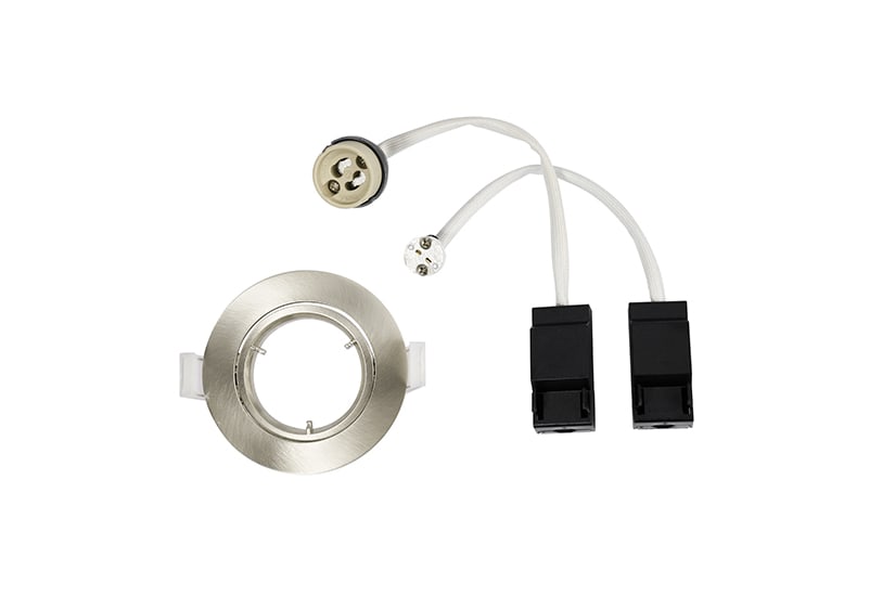 Faretto orientabile, φ85*28 mm, foro φ75 mm, montaggio a incasso a soffitto, IP20, IK02, corpo e cornice in alluminio, grigio, angolo di inclinazione 12°, 3 anni di garanzia. Accessori: portalampada GU10*1 (2x0,75 mm²-1,5 mm²) + portalampada GU5.3*1 (entrambi con cavo in tessuto bianco da 150 mm e scatola di giunzione con 2 terminali da 0,75 mm²-1,5 mm²)