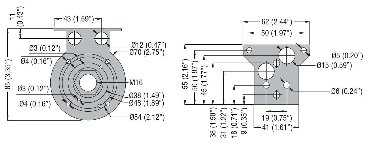 BASE DI FISSAGGIO. Ø62MM, FISSAGGIO A PARETE A 90°, PLASTICO, COLORE GRIGIO.