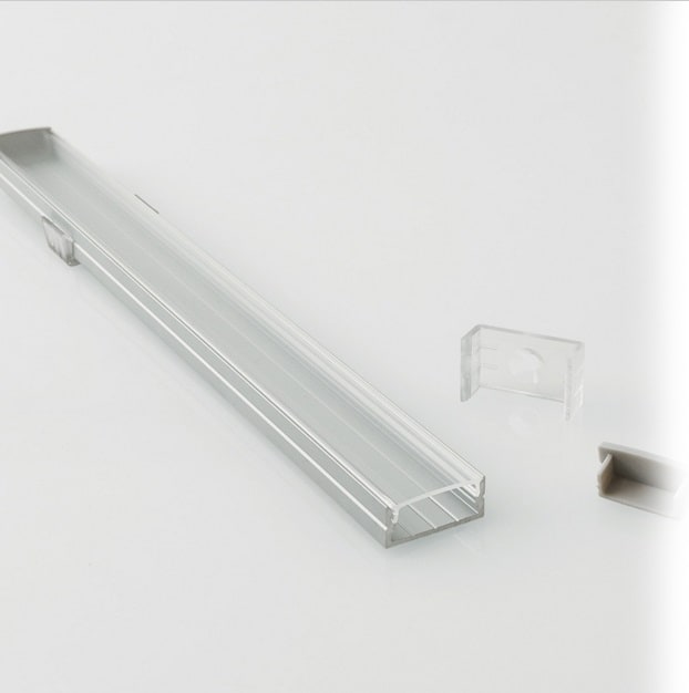 Profilo in alluminio da superficie per striscia LED con diffusore opale di 2m. Tappi e clip di fissaggio inclusi.