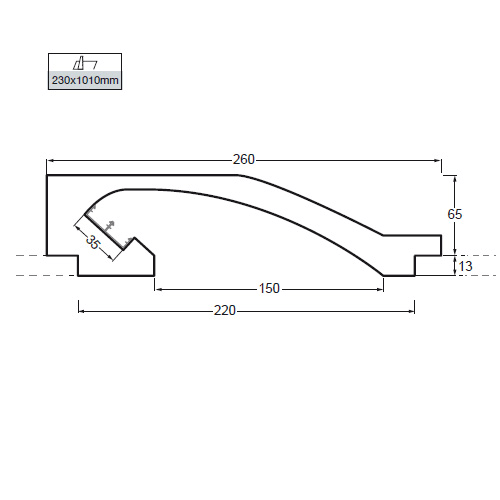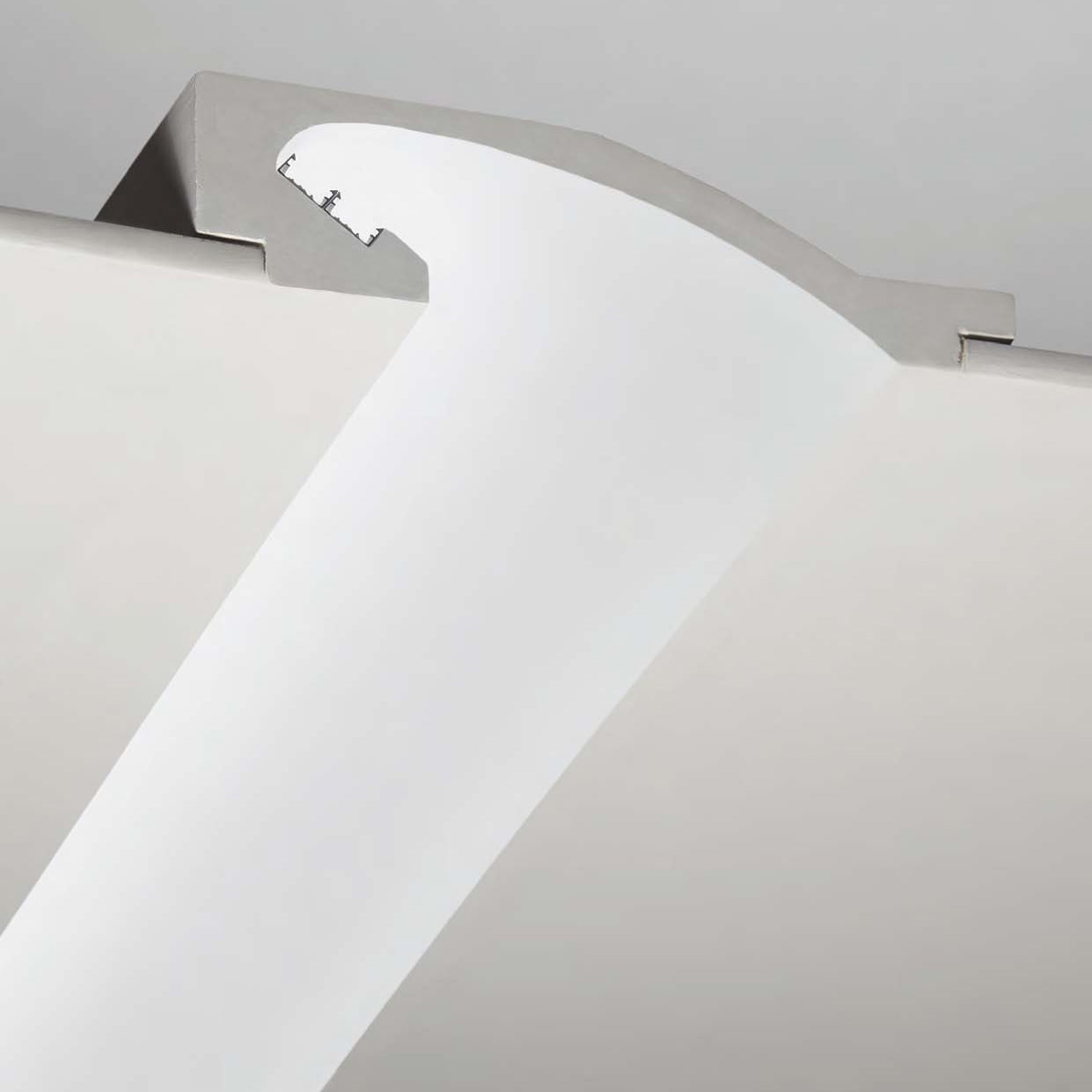 Incasso a soffitto o a parete per installazione in controsoffitti di cartongesso di spessore 13mm. Profilo prefinito in gesso completo di due barre di alluminio per l’installazione di due strisce LED. Chiusure laterali da effettuare durante il montaggio.